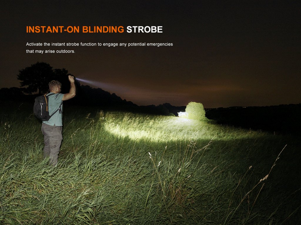 - Sedem režimov svietenia: 2800 lúmenov (2,6 hodiny) -> 1000 (2,8 hodiny) -> 350 lúmenov (6,6 hodiny) -> 150 lúmenov (16,6 hodiny) -> 20 lúmenov (65 hodín) -> stroboskop 2800 lúmenov -> SOS 150 lúmenov.