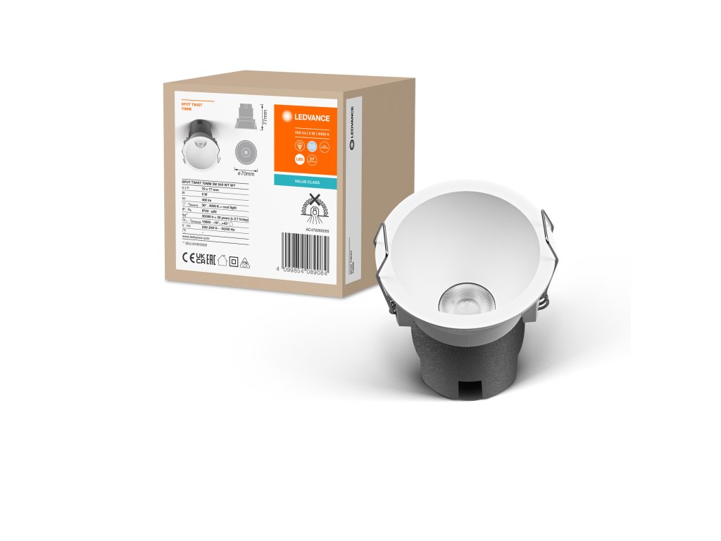 Zapuštěné bodové svítidlo s integrovanou LED. Vlastnosti výrobku: Pružiny chráněné silikonovou podložkou. Výhody výrobku: Úspora energie až 90 % ve srovnání s bodovým světlem halogenových žárovek. Snadná instalace a elektrické připojení díky elektrickým konektorům bez použití nářadí. Oblasti použití: Použití uvnitř. Všeobecné osvětlení. Výbava / příslušenství: Konektorová krabice není součástí dodávky.Dodatočné parametre