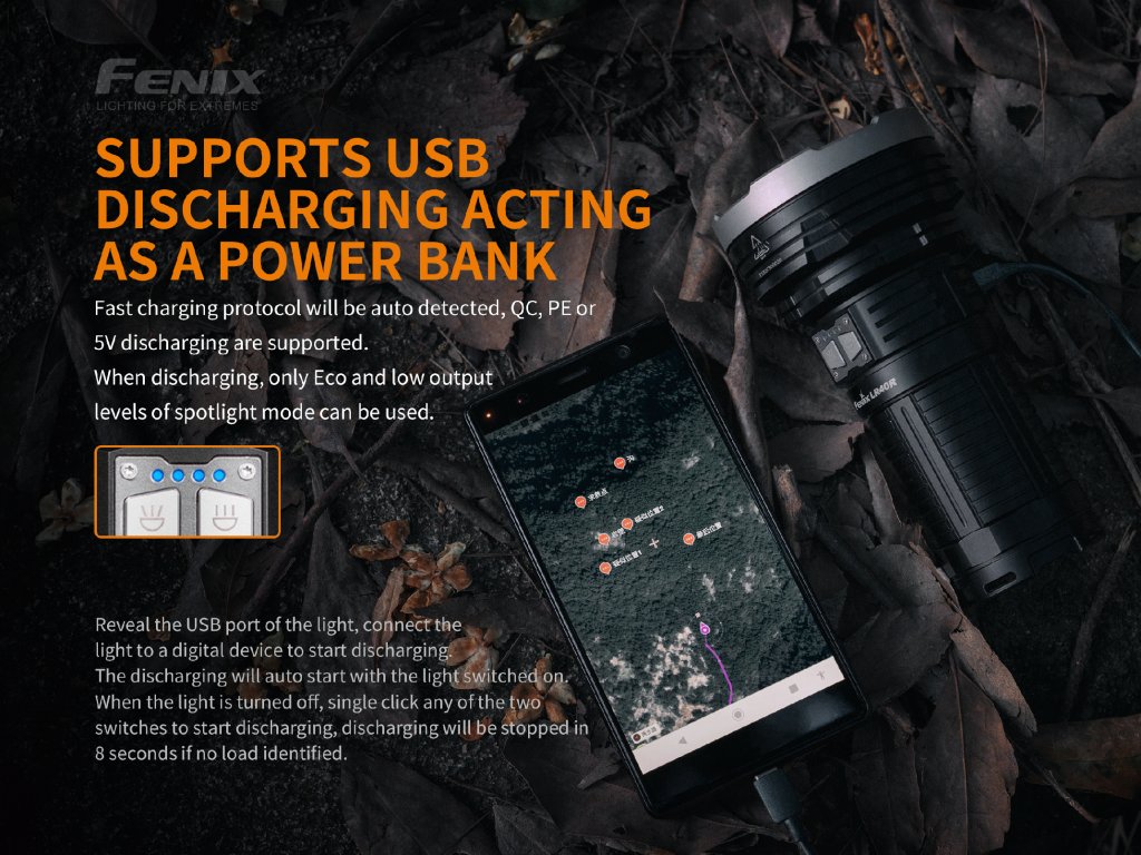 Svietidlo je naviac vybavené indikačnými LED, ktoré ukazujú stav nabitia akumulátora. Svietidlo je tiež možné núdzovo použiť aj ako POWERBANK a nabíjať z nej ďalšie USB zariadenia. Aj napriek obrovskému výkonu si svietidlo uchováva prekvapivo kompaktné rozmery, dĺžka je len 15,4 centimetra a hmotnosť je 698 gramov vrátane akumulátora. Toto vyhľadávacie svietidlo je vhodné napríklad pre stráženie veľkých areálov, služobné použitie či prieskumné a záchranné operácie a pre všetkých nadšencov do svietidiel.