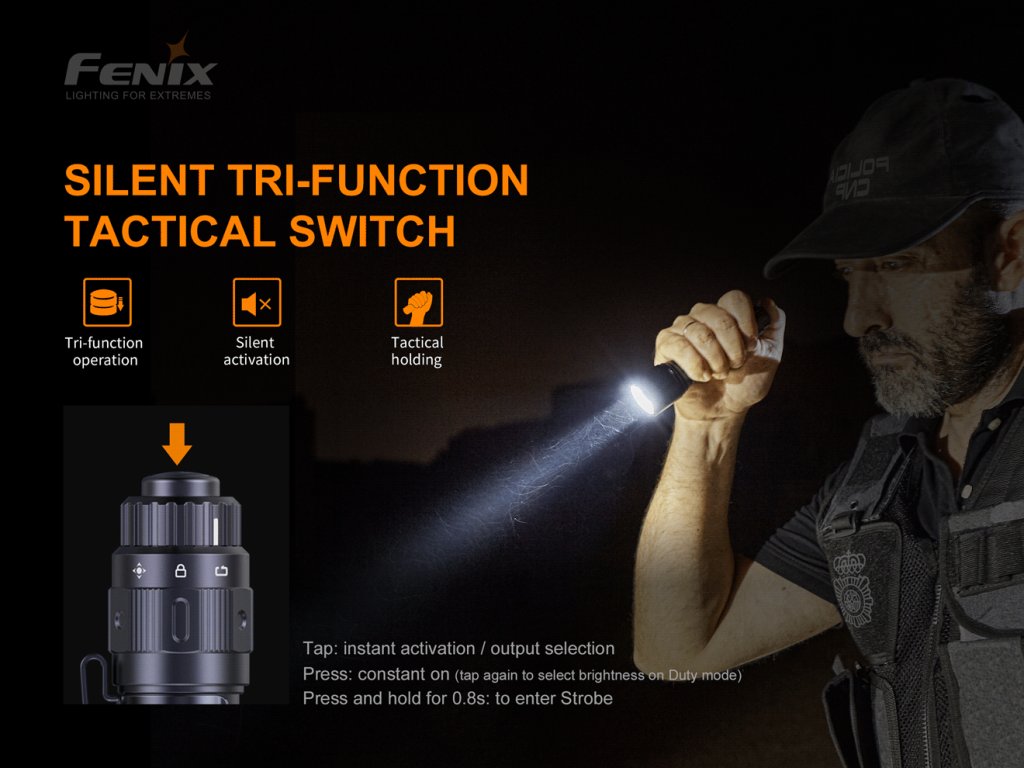 Otočným ovládačom na konci svietidla možno voliť medzi módmi svietenia, ktoré majú odlišné ovládanie. Taktický mód (otočný ovládač v ľavej polohe): Pre zapnutie stlačte taktické tlačidlo na konci svietidla, pre okamžitú aktiváciu tlačidlo jemne pridržte. Svietidlo sa vždy aktivuje v najvyššom režime. Pre aktiváciu stroboskopu podržte tlačidlo stlačené po dobu 0,8 sekundy (aj z vypnutého stavu). Jemným zatlačením na tlačidlo sa svietidlo vráti do pôvodného režimu. Stlačením tlačidla sa svietidlo vypne. Služobný mód (otočný ovládač v pravej polohe): Pre zapnutie stlačte taktické tlačidlo na konci svietidla, pre okamžitú aktiváciu tlačidlo jemne pridržte. Svietidlo si pamätá posledný navolený režim (okrem stroboskopu). Režimy svietenia (okrem stroboskopu) možno cyklicky meniť stlačením tlačidla. Pre aktiváciu stroboskopu podržte tlačidlo po dobu 0,8 sekundy (aj z vypnutého stavu). Jemným zatlačením na tlačidlo sa svietidlo vráti do pôvodného režimu. Stlačením tlačidla sa svietidlo vypne. V prostrednej polohe otočného ovládača je možné uzamknúť ovládacie tlačidlo. Ak je svietidlo vypnuté, nejde zapnúť. Ak je zapnuté, dôjde k uzamknutiu ovládania v aktuálne nastavenom režime svietenia a ovládacie tlačidlo nebude reagovať. Pre opätovnú aktiváciu taktického tlačidla je nutné otočiť ovládač do taktického alebo služobného módu. Pri použití káblového spínača je dostupný len najvyšší režim stáleho svietenia. Inteligentná ochrana proti prehriatiu: Ak teplota svietidla presiahne 60°C, potom sama zníži výkon v postupných krokoch, kým teplota neklesne pod bezpečnú hranicu. Po ochladení pod 60°C je možné opäť používať plný výkon. Upozornenie na vybité batérie - svietidlo postupne automaticky prepne do najnižšieho výkonu a každých päť minút 3x zabliká.