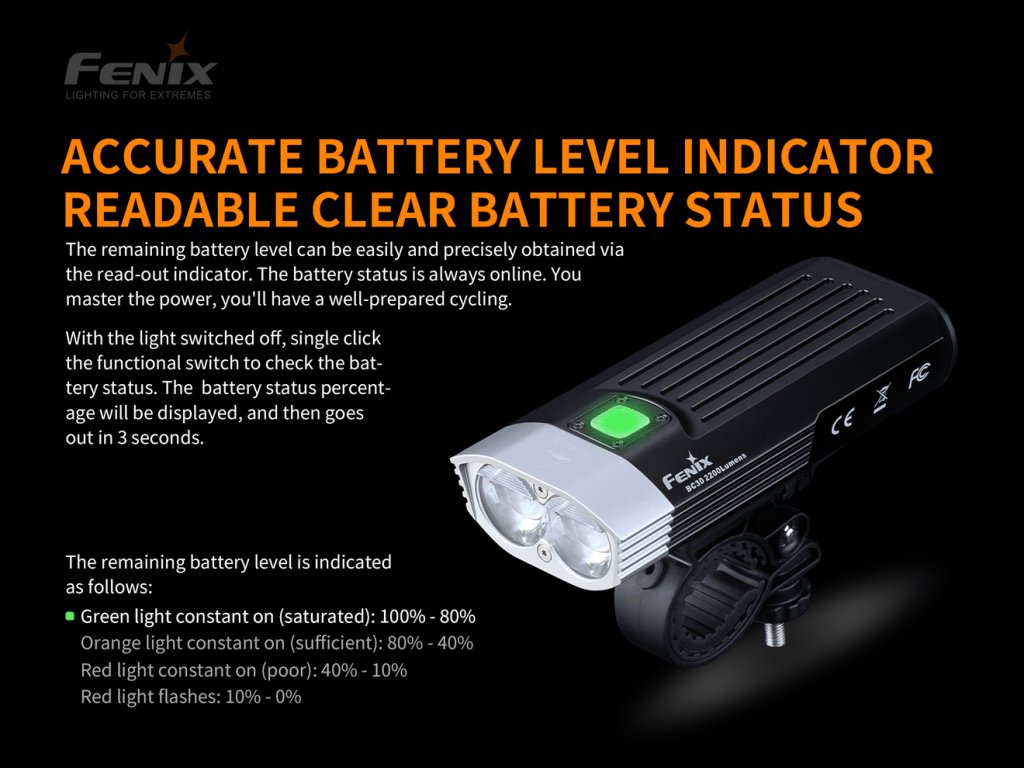 Indikácia stavu nabitia batérií - počas prevádzky svietidla svieti indikačná dióda v tlačidle. Ak indikačná dióda svieti zeleno, sú batérie nabité na viac ako 80%. Oranžové svietenie znamená 40-80% kapacity. Ak svieti na červeno, batérie sú nabité na 10-40%. Červené blikanie značí, že zostáva menej ako 10% kapacity batérii (funguje iba pri použití Li-ion akumulátorov 18650). Ak už tlačidlo bliká na červeno, tak svietidlo automaticky prepne výkon do nižších režimov na zabezpečenie čo najdlhšej výdrže. V takom prípade odporúčame čo najskôr vymeniť batérie za nabité, aby nedošlo k vypnutiu ochrannej elektroniky zabudovanej v akumulátoroch a tým pádom k zhasnutiu. Indikáciu možno zapnúť aj pri vypnutom svietidle, stačí krátko stlačiť ovládacie tlačidlo a potom sa indikačná LED rozsvieti na tri sekundy. Poznámka: ukazovateľ vybitých batérií je pre správnu funkciu prispôsobený akumulátorom 18650, pri použití jednorazových CR123A článkov nemusí signalizovať správne.